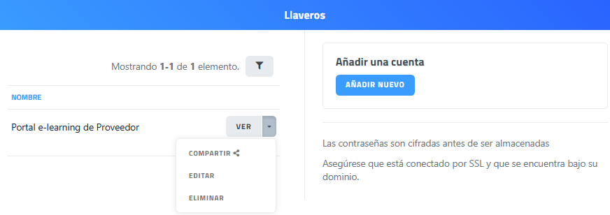 - El llavero dispone de funcionalidad para compartir contraseñas con otros usuarios de forma segura.