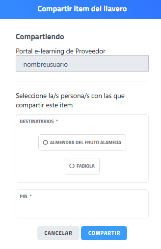 4. Se abre la Interfaz de "Compartir item del llavero"