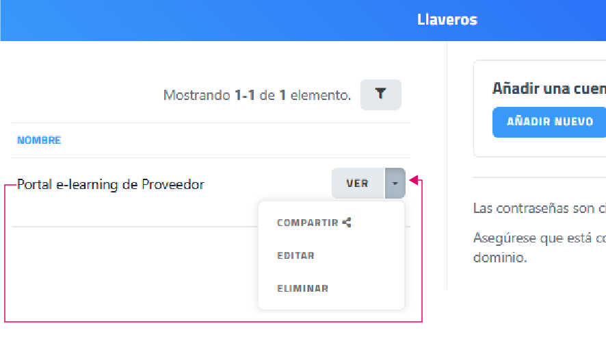 Solo se puede compartir una contraseña con usuarios que tengan permiso para acceder al módulo llavero.