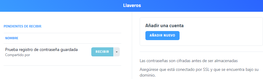 - El usuario receptor verá en su llavero una lista adicional de las claves pendientes de recibir que otro/os usuario/os han compartido con él.