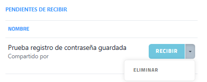 - Al hacer clic en el icono ▼ presente en el botón "RECIBIR" del registro de la contraseña recibida se accede a la acción de eliminar el registro pendiente de recibir.