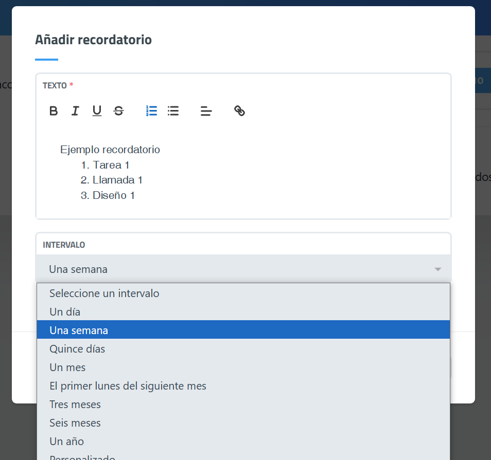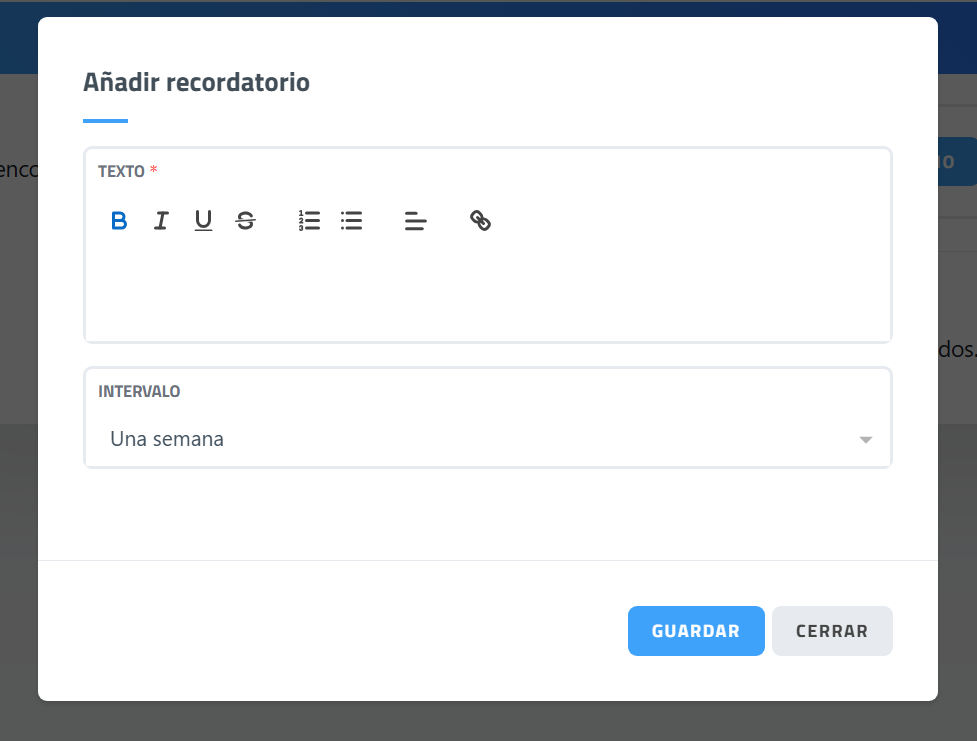 En la interfaz de Añadir recordatorio se encuentran, el editor de texto, el botón de acceso a establecer intervalo y los botones de guardar y cerrar