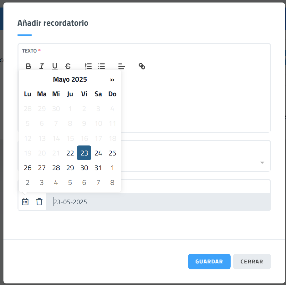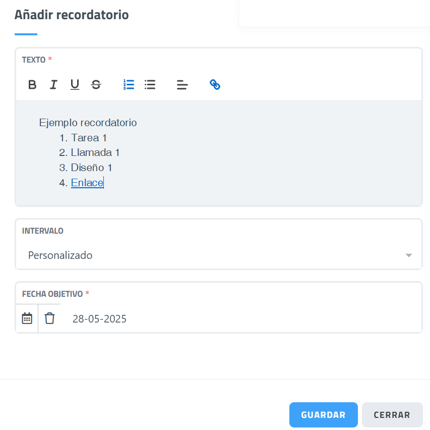 8. Para actualizar el recordatorio o eliminarlo hacer clic en el texto reflejado en el recordatorio guardado.