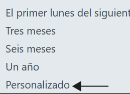 4. Entre las opciones de intervalo se presenta la de personalizado. Permite especificar el intervalo con ajuste más preciso que el resto de las opciones. Muestra un en un calendario para que el usuario pueda elegir el día del mes y del año.