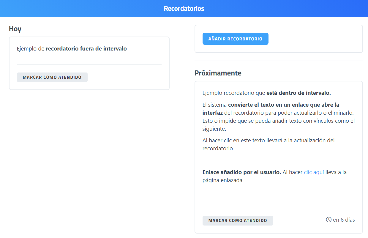 6. El recordatorio se mostrará en la lista de recordatorios con un botón para marcar como atendido.