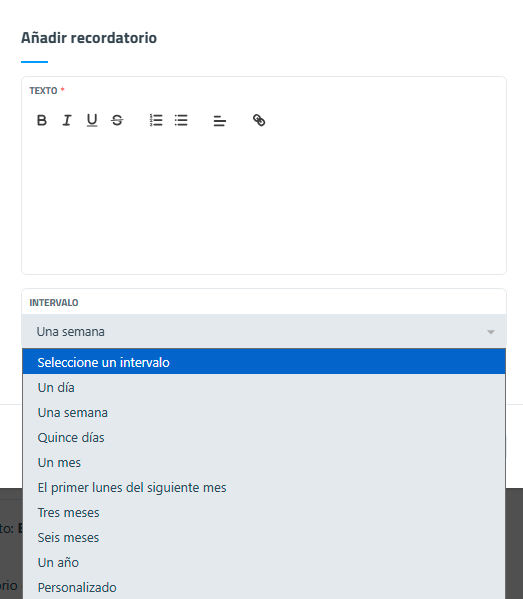 En la interfaz de Añadir recordatorio se encuentran, el editor de texto, el botón de acceso a establecer intervalo y los botones de guardar y cerrar