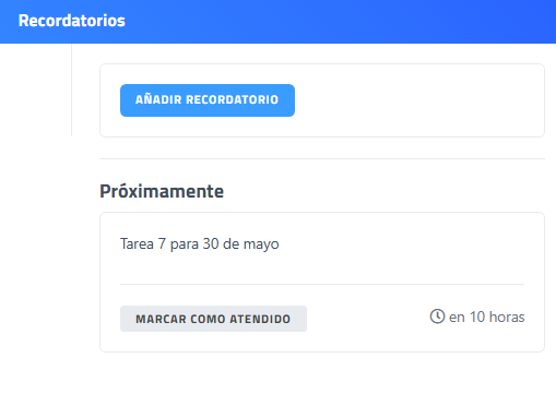 • En la columna de la derecha muestra los recordatorios que aún no han llegado ni excedido la fecha de finalización. Con botón de "Marcar como atendido". Así se mantiene mientras no se hagan cambios en el recordatorio.