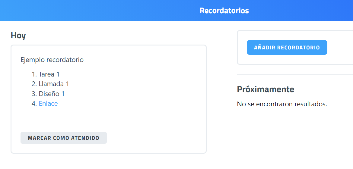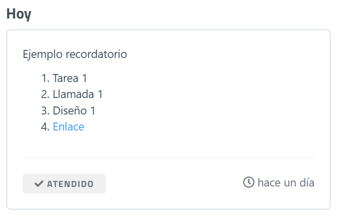 • En la columna izquierda. Cuando los recordatorios llegan a la fecha de finalización pasan automáticamente a la columna izquierda con el botón de "Marcar como atendido". Así se mantiene mientras no se hagan cambios en el recordatorio.