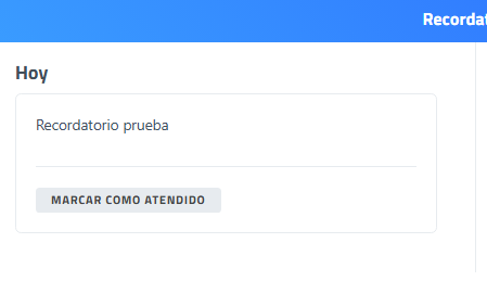 Al marcar como atendido el recordatorio mostrará el estado del recordatorio a "Atendido" y al actualizar la pestaña del navegador el recordatorio desaparece de la lista de recordatorios.