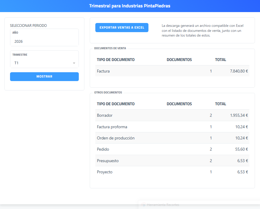 En la página de "Trimestral"  permite consultar y exportar un resumen trimestral de documentos de venta de la entidad fiscal seleccionada, mostrando el número de documentos y sus importes totales por tipo.