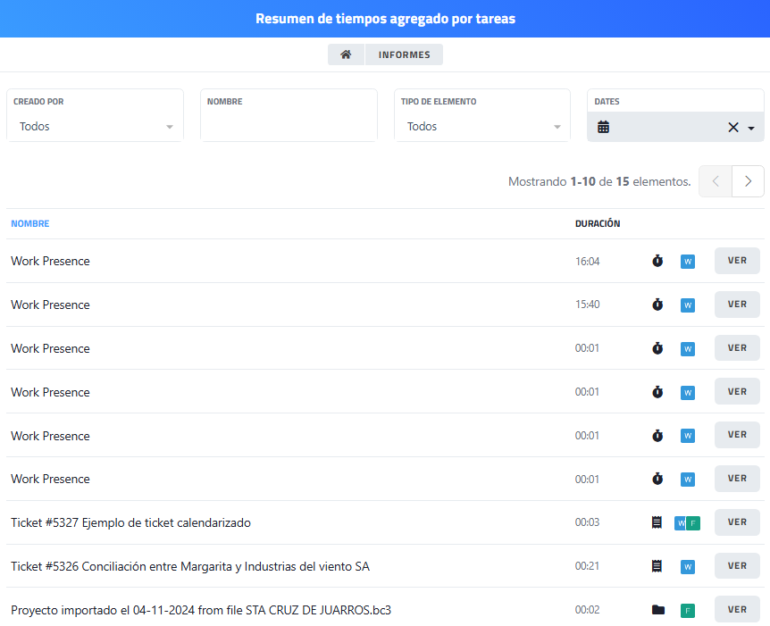 Esta página permite consultar un resumen agregado del tiempo registrado por tareas, mostrando la duración total dedicada a cada elemento (tareas, tickets, proyectos, etc.).