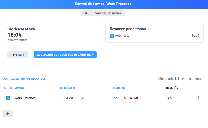 Esta página muestra el detalle del tiempo registrado en un tipo de actividad concreto (en este caso, Work Presence), incluyendo el total acumulado, su distribución por usuario y los registros individuales asociados.