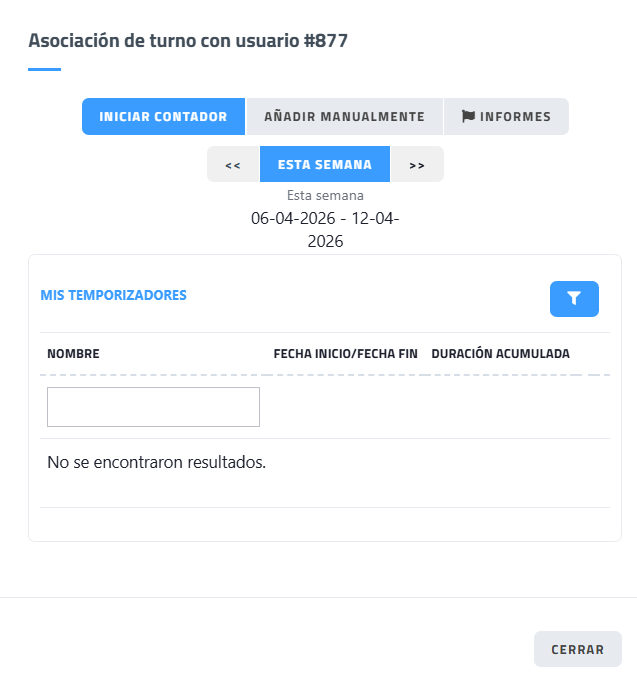Esta página permite gestionar y registrar tiempos de trabajo asociados a un usuario específico, ya sea iniciando un contador en tiempo real o introduciendo registros manualmente.