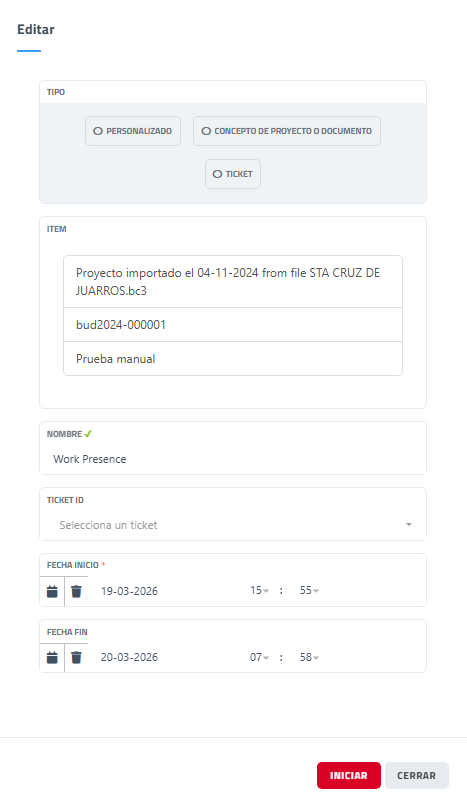 Esta página permite crear o editar un registro de tiempo, definiendo el tipo de elemento asociado (proyecto, documento, ticket o personalizado), así como las fechas y horas de inicio y fin.