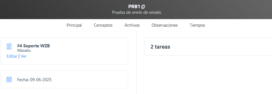 Permite navegar entre secciones (Principal, Conceptos, Archivos, Observaciones, Tiempos). |