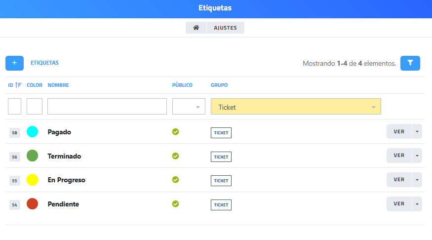 Mostrará todas las etiquetas que se han creado para el uso con tickets y cuáles están activas o no. Se pueden añadir más etiquetas desde el botón +. Para más detalles consultar el capítulo y páginas relacionadas con esta sección.