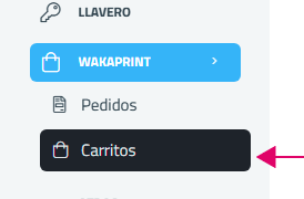 Desde la opción del navegador lateral Wakaprint > se presentan dos opciones, un de ellas es la de "Carritos".