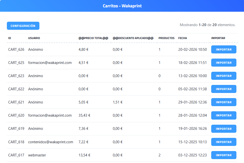 | Campo "ID Usuario en Wakaprint" | Identificador numérico del usuario en el sistema Wakaprint al que se asociarán los pedidos o carritos importados. * |