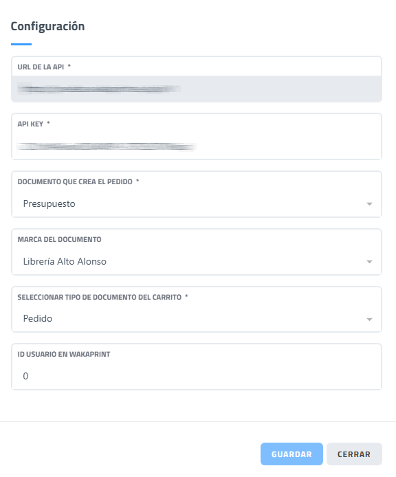 | Campo "URL de la API" | Permite introducir la dirección del servicio API Wakaprint con el que el sistema se conectará para realizar las integraciones. Es un campo obligatorio. |