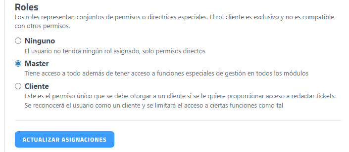 - Cliente. se asigna a usuarios externos, como clientes de la empresa, permitiéndoles acceder a funcionalidades específicas, como la gestión de tickets de su propia empresa, con una visibilidad y capacidad de edición restringida.