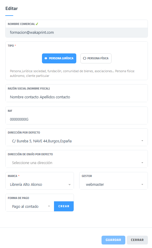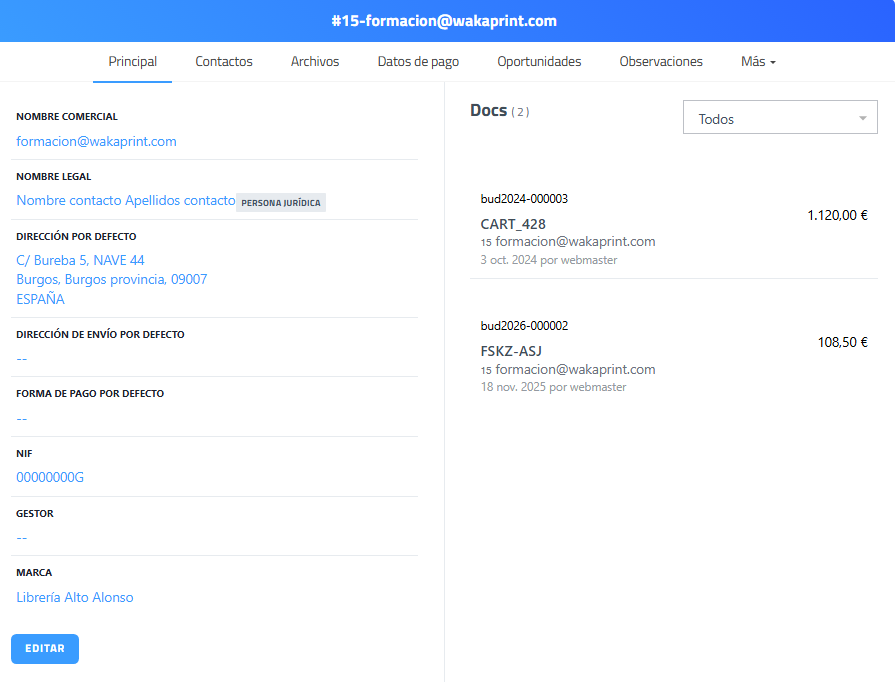 | Cabecera “#15-formacion@wakaprint.com” | Muestra el identificador y nombre del registro que se está visualizando. |