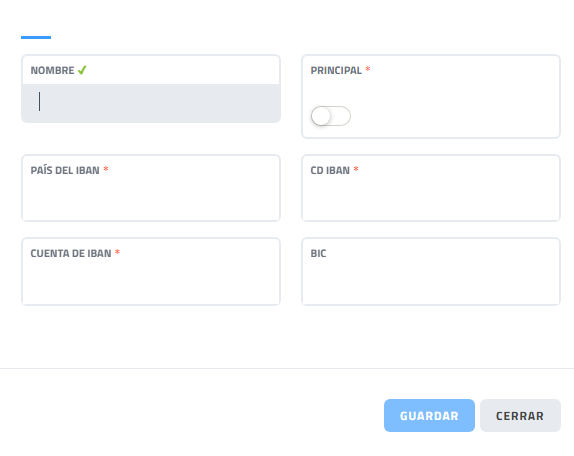| País del IBAN * | Permite seleccionar el país correspondiente al IBAN. Es obligatorio para validar correctamente la estructura del número de cuenta. |