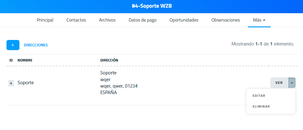 Indicador “Mostrando 1-1 de 1 elemento” Informa del número de direcciones registradas y visibles en el listado.