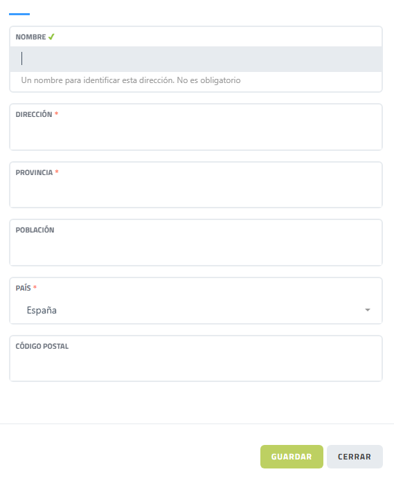 Campo “Nombre” ✓ Permite asignar una etiqueta identificativa a la dirección (por ejemplo, “Oficina”, “Almacén”, “Soporte”). No es obligatorio.