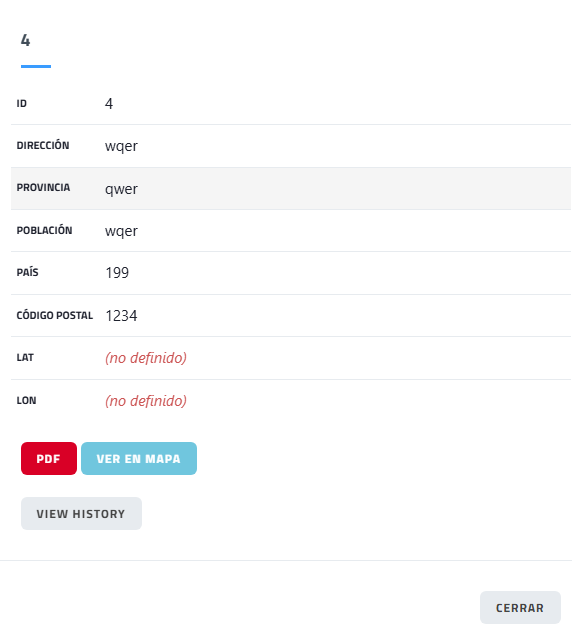 Abre un modal que muestra el detalle completo de una dirección asociada a un cliente o proveedor. Incluye campos como la dirección, provincia, país y código postal. Si hay coordenadas geográficas (latitud y longitud), también se mostrarían. Además, ofrece opciones para generar un PDF con la información, visualizar la ubicación en un mapa (si hay coordenadas) y revisar el historial de cambios. Finalmente, el botón "Cerrar" permite salir del modal sin realizar cambios.