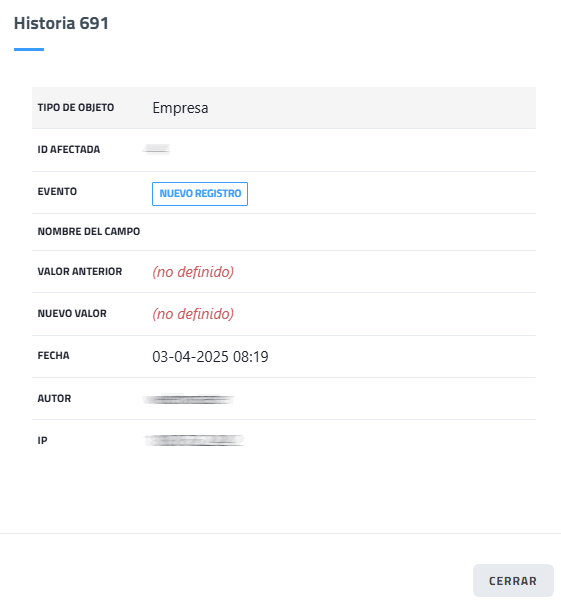 Esta interfaz muestra el historial de cambios relacionados con la ficha del cliente o proveedor. En cada registro se detalla qué usuario realizó una acción (como crear o modificar un dato) y la marca de tiempo asociada a esa acción.