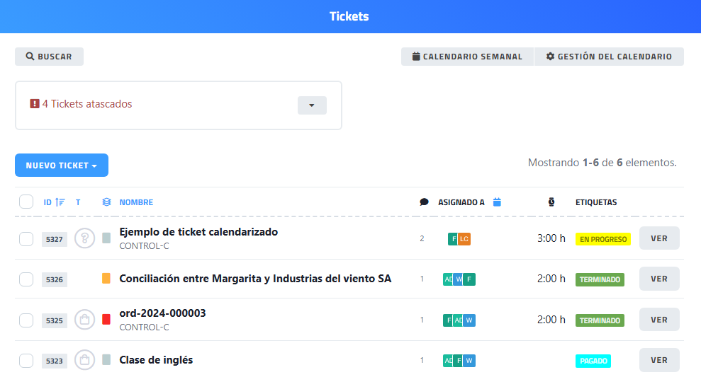 Etiquetas Indicadores visuales de color con texto. Facilitan identificar rápidamente información sobre el ticket.
