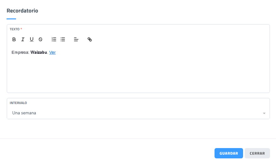 Referencia “Empresa: [Nombre] – Ver” Indica la empresa a la que está asociado el recordatorio y permite acceder directamente a su ficha.