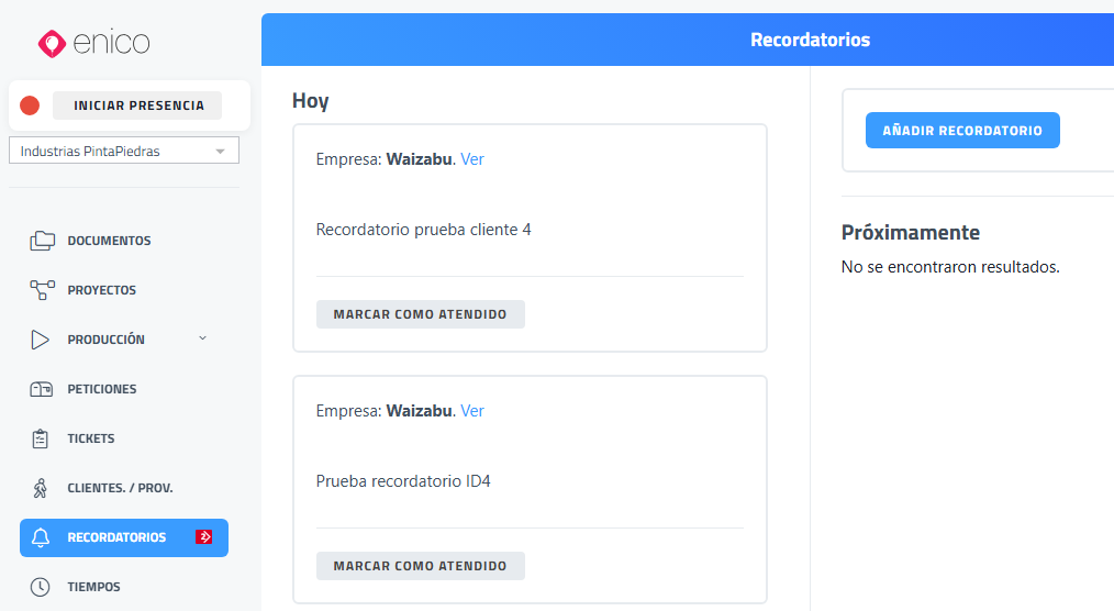 Los recordatorios creados serán mostrados en la sección llamada "RECORDATORIOS" del navegador lateral de ENICO.