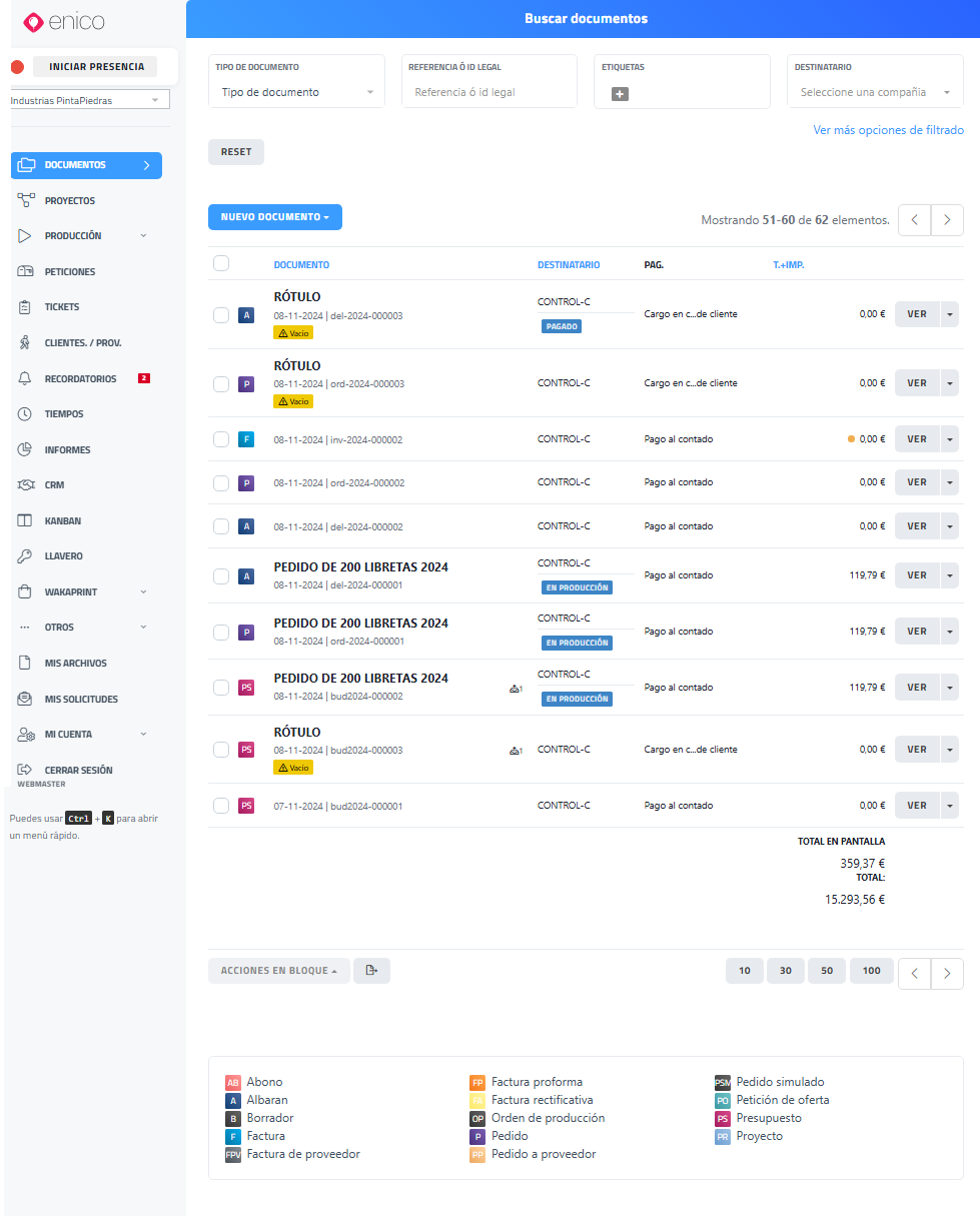 Desde esta página es posible buscar, filtrar y revisar documentos según distintos criterios, como el tipo de documento, la referencia, las etiquetas o el destinatario. Además, permite crear nuevos documentos, acceder al detalle de los existentes y realizar acciones sobre varios documentos de forma simultánea.
