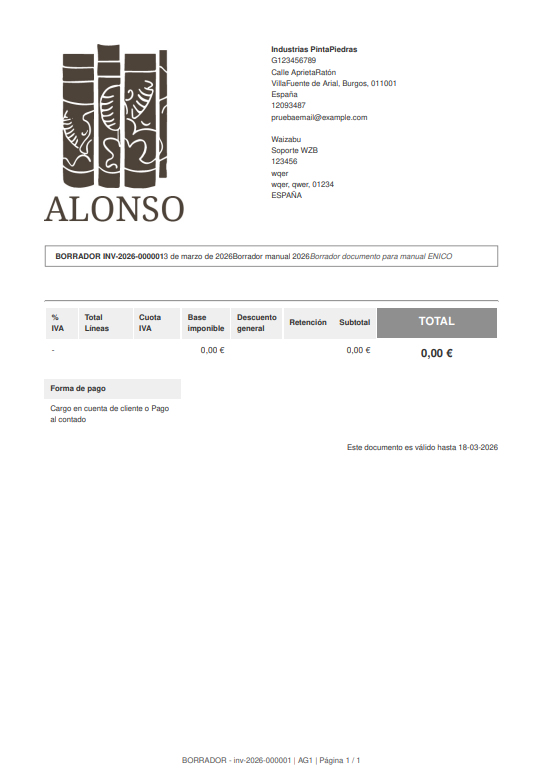 En la vista en lista de los documento tipo borrador usado como ejemplo, con referencia: inv-2026-000001, se muestra un aviso de que el documento no tiene conceptos. Está vacío.