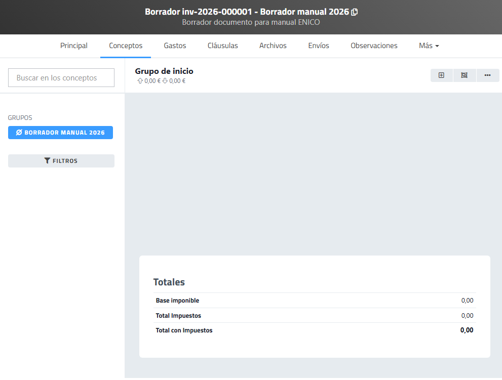 La interfaz de conceptos permite añadir, organizar y actualizar las líneas que componen un documento. A través de los grupos, el buscador y los filtros, el usuario puede gestionar fácilmente los conceptos incluidos, mientras que la sección de totales calcula automáticamente los importes (base imponible, impuestos y total) en función de la información introducida.