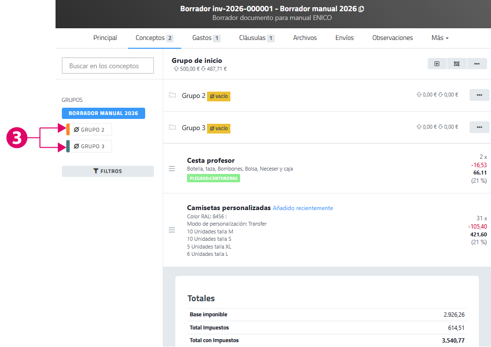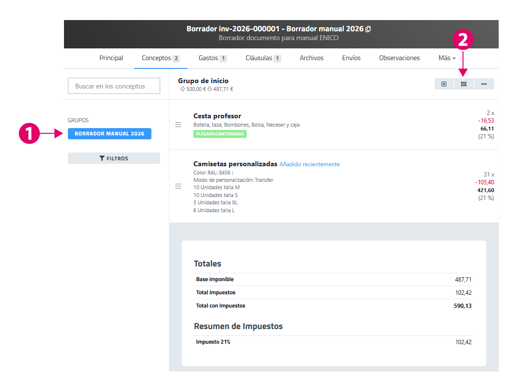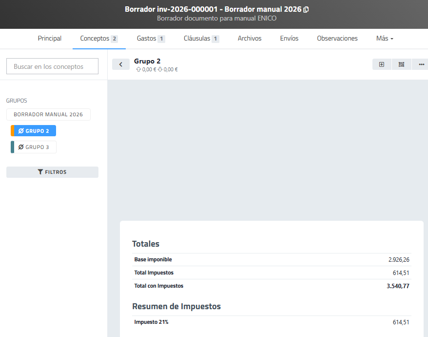 En la zona de líneas de conceptos del documento se observan los dos grupos creados. Con icono informativo de carpeta. Lo que quiere decir que si se hace clic en la línea de concepto del grupo se abrirá el grupo y se podrán gestionar y consultar conceptos dentro de él.