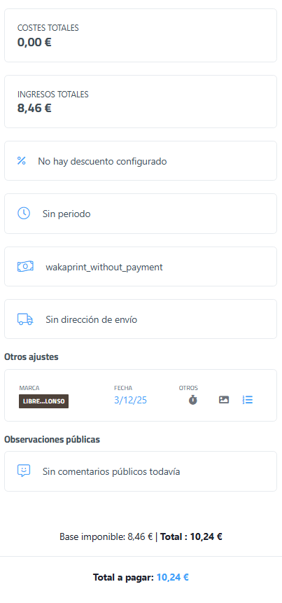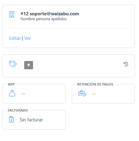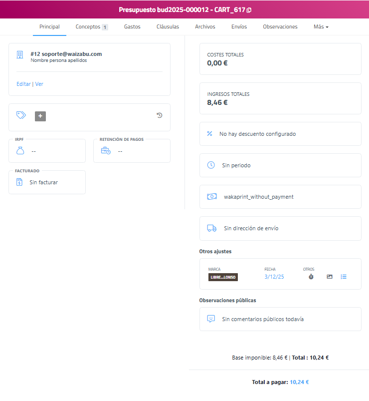 | Bloque Cliente / Contacto | Muestra el nombre del cliente o contacto asociado al documento, incluyendo identificador interno y datos básicos. En la imagen de ejemplo: #12 soporte@waizabu.com Creado el documento desde módulo de Wakaprint: