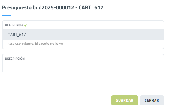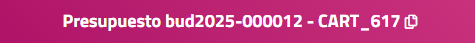 Muestra la referencia del documento permitiendo su trazabilidad con otros registros del sistema. En la imagen de ejemplo siendo un documento tipo presupuesto, bud2025-000012. Creado desde módulo de Wakaprint: