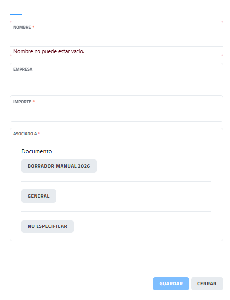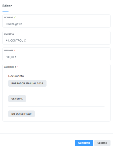 En este formulario el usuario puede indicar el nombre del gasto, la empresa asociada y el importe correspondiente. Además, es posible definir si el gasto se vincula al documento completo o si se registra sin especificar un elemento concreto dentro del documento.