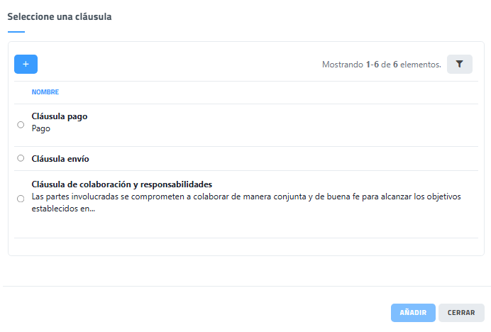 Desde esta interfaz el usuario puede visualizar las cláusulas disponibles, revisar su contenido resumido y seleccionar la que desea incorporar al documento. Una vez seleccionada la cláusula correspondiente, puede añadirse al documento mediante el botón Añadir.