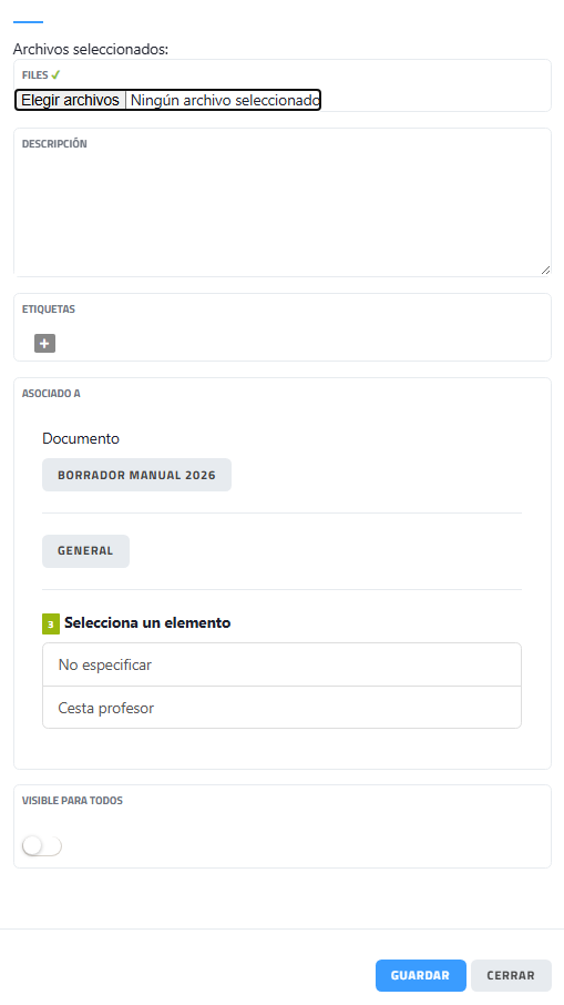 El usuario puede seleccionar uno o varios archivos desde su equipo mediante el botón Elegir archivos. Los archivos seleccionados se adjuntarán al documento una vez que se complete el proceso de guardado.