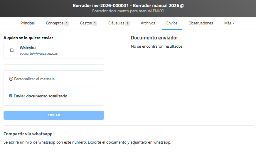 | Compartir vía WhatsApp | Permite abrir una conversación en WhatsApp para compartir el documento manualmente. |