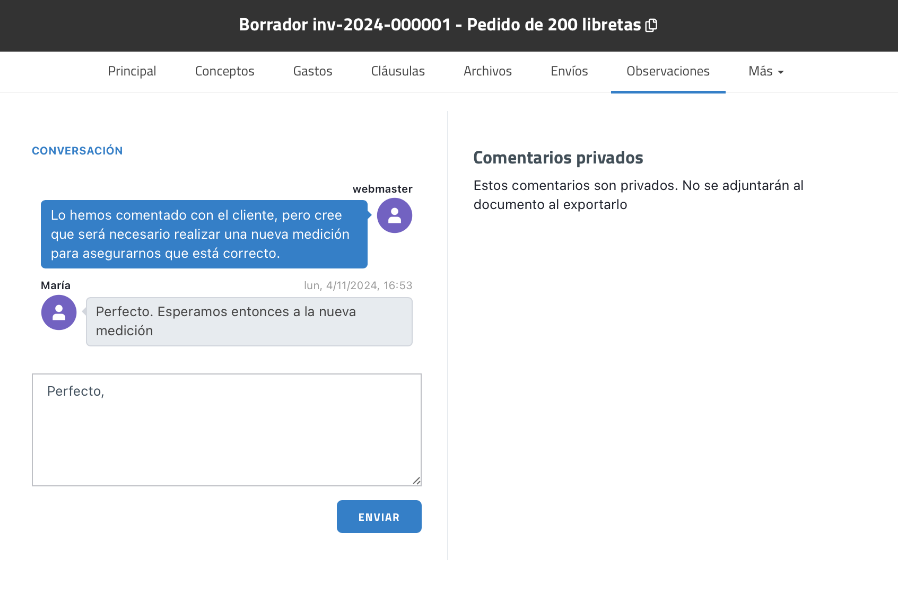 Las observaciones registradas son comentarios privados, lo que significa que no se incluirán en el documento exportado ni serán visibles para el cliente o destinatario. Esto permite utilizar esta sección para coordinar el trabajo interno, aclarar detalles o registrar información relevante durante el proceso de gestión del documento.