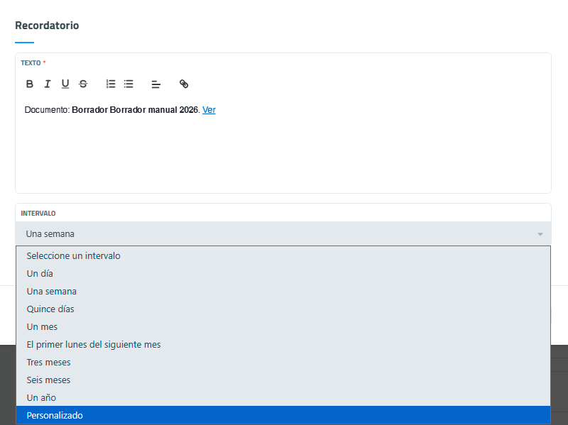 Interfaz de añadir recordatorio vinculado al documento. Observar el selector llamado intervalo con el que se puede especificar tiempo para el contador del recordatorio, con selector de opciones, o personalizable.