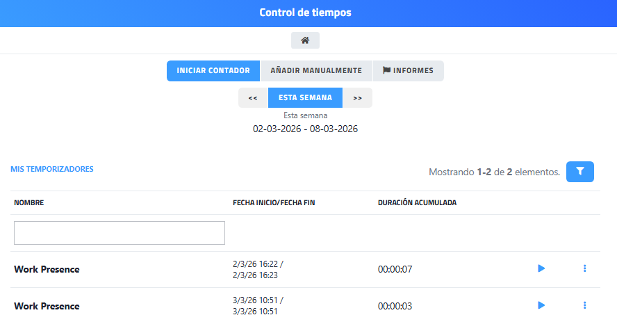Ejemplo;Interfaz de consulta de registro de tiempos contabilizados en el documento.
