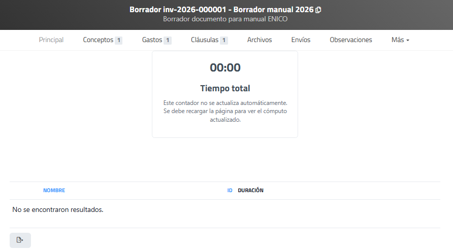Si el módulo de medida de tiempos está activado, esta opción da acceso al resumen de tiempos asociados al documento, permitiendo un seguimiento de las horas invertidas en relación con este.