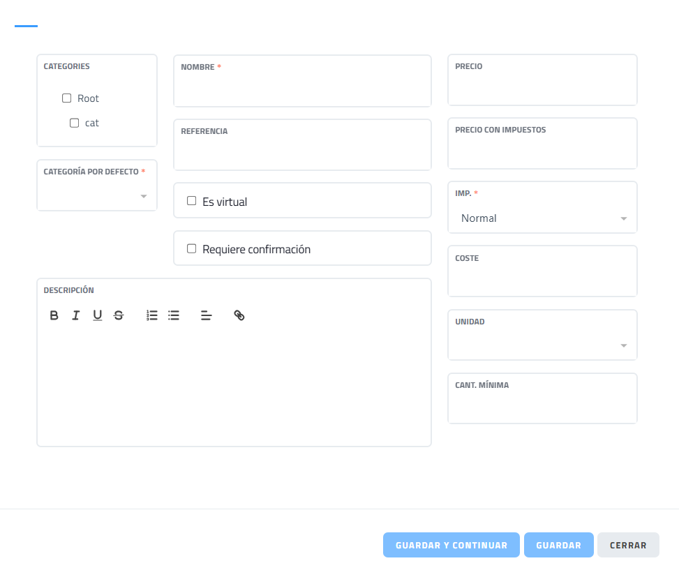 | Unidad | Permite definir la unidad de medida del producto (unidad, horas, kg, etc.). |