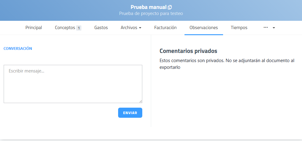 Los comentarios registrados en esta pestaña son privados, por lo que no se incluirán en los documentos generados ni al exportarlos.