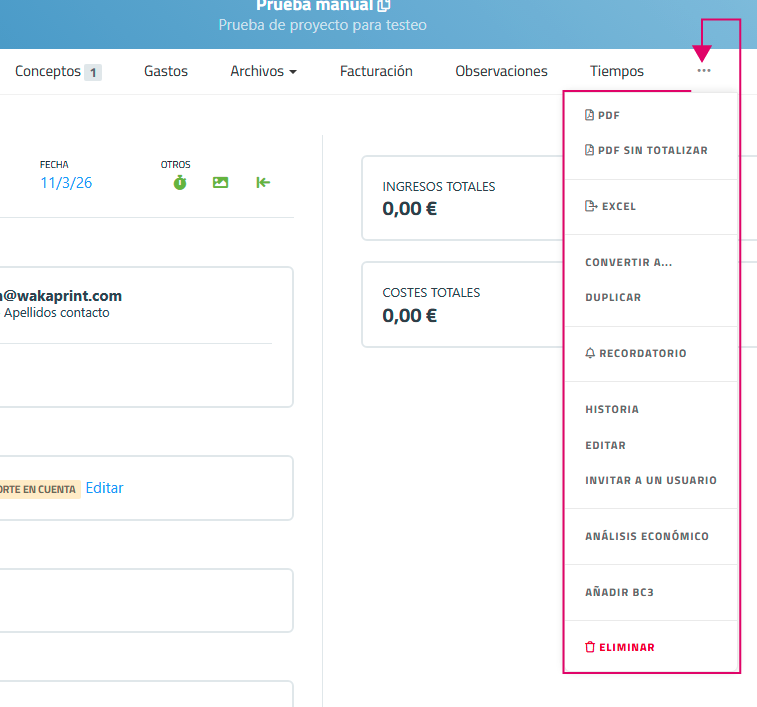 Este menú se despliega desde el botón de acciones del proyecto y ofrece accesos directos a diversas funcionalidades relacionadas con la gestión del proyecto.